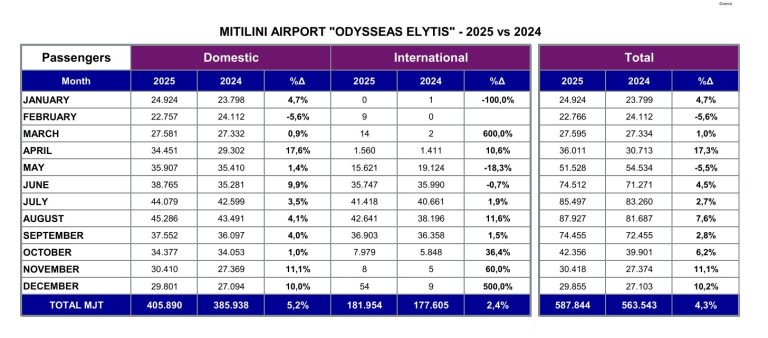 Ανοδική πορεία κατέγραψε η επιβατική κίνηση στον Αερολιμένα Μυτιλήνης Αεροδρόμιο Μυτιλήνης «Οδυσσέας Ελύτης» τον Δεκέμβριο του 2025, σύμφωνα με τα επίσημα στοιχεία της Fraport Greece.