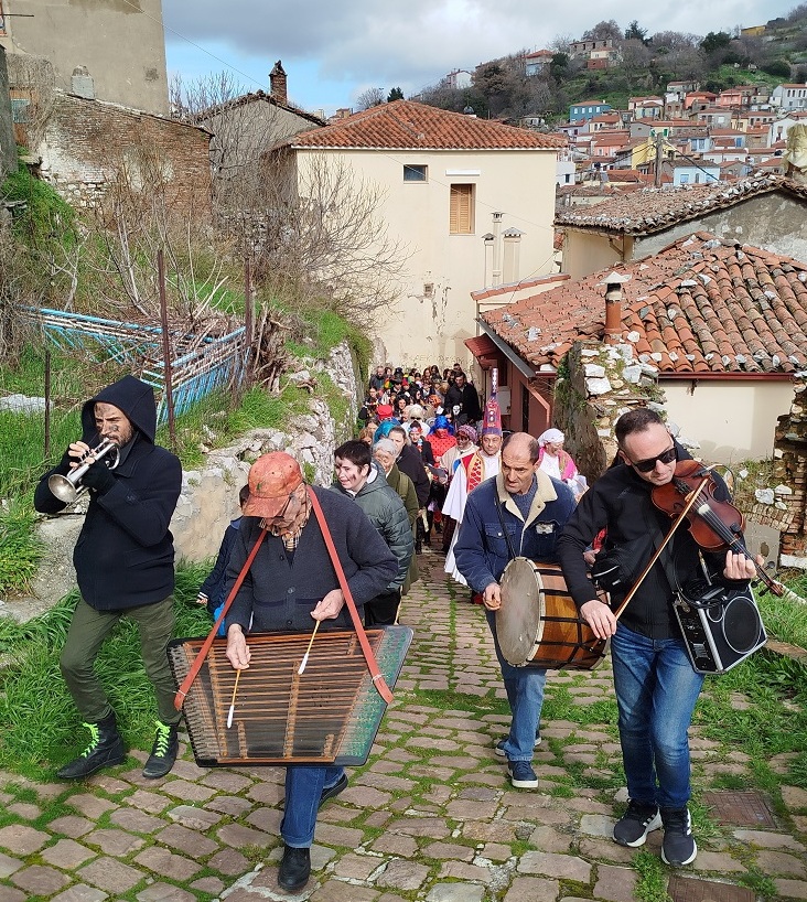 Κορυφαία στιγμή των εκδηλώσεων αποτέλεσε η παραδοσιακή πατινάδα το μεσημέρι της Κυριακής της Τυροφάγου, 22 Φεβρουαρίου 2026. Πολυπληθής όμιλος μασκαρεμένων, με επικεφαλής τον Μεγαλέξαντρο –τον οποίο ενσάρκωσε ο Παναγιώτης Κορομηλάς– και με τη συνοδεία παραδοσιακής μουσικής κομπανίας, αναβίωσε το έθιμο της Περικεφαλαίας. Η πομπή διέσχισε τους μαχαλάδες του χωριού, τραγουδώντας τριψίματα και παλιά σατιρικά τραγούδια, για να καταλήξει στην Πλατεία Αγοράς. Ξεχώρισαν στα τριψίματα η Μυρσίνη και η Κατερίνα Κουτσκουδή-Βουρλή.