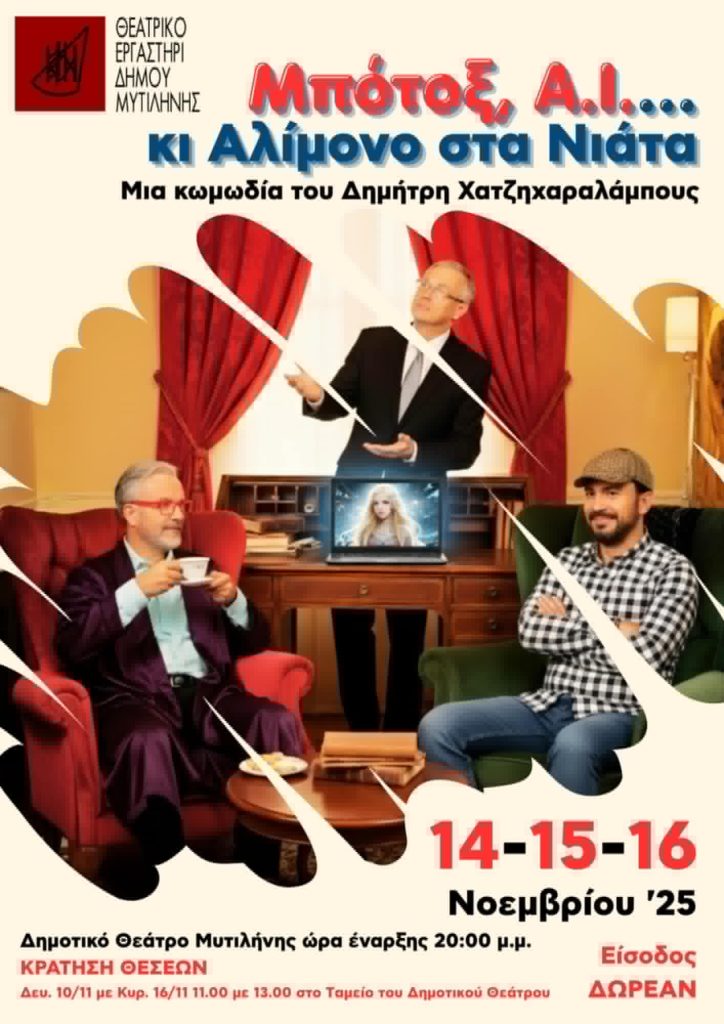Με φόντο τη Μυτιλήνη του 2025, το Θεατρικό Εργαστήρι του Δήμου Μυτιλήνης παρουσιάζει στις 14, 15 και 16 Νοεμβρίου στο Δημοτικό Θέατρο τη νέα του παραγωγή με τίτλο «Μπότοξ, ΑΙ… κι αλίμονο στα νιάτα», ένα σύγχρονο έργο εμπνευσμένο από τον μύθο του Φάουστ και την κλασική κωμωδία του Αλέκου Σακελλάριου «Αλίμονο στα νιάτα».