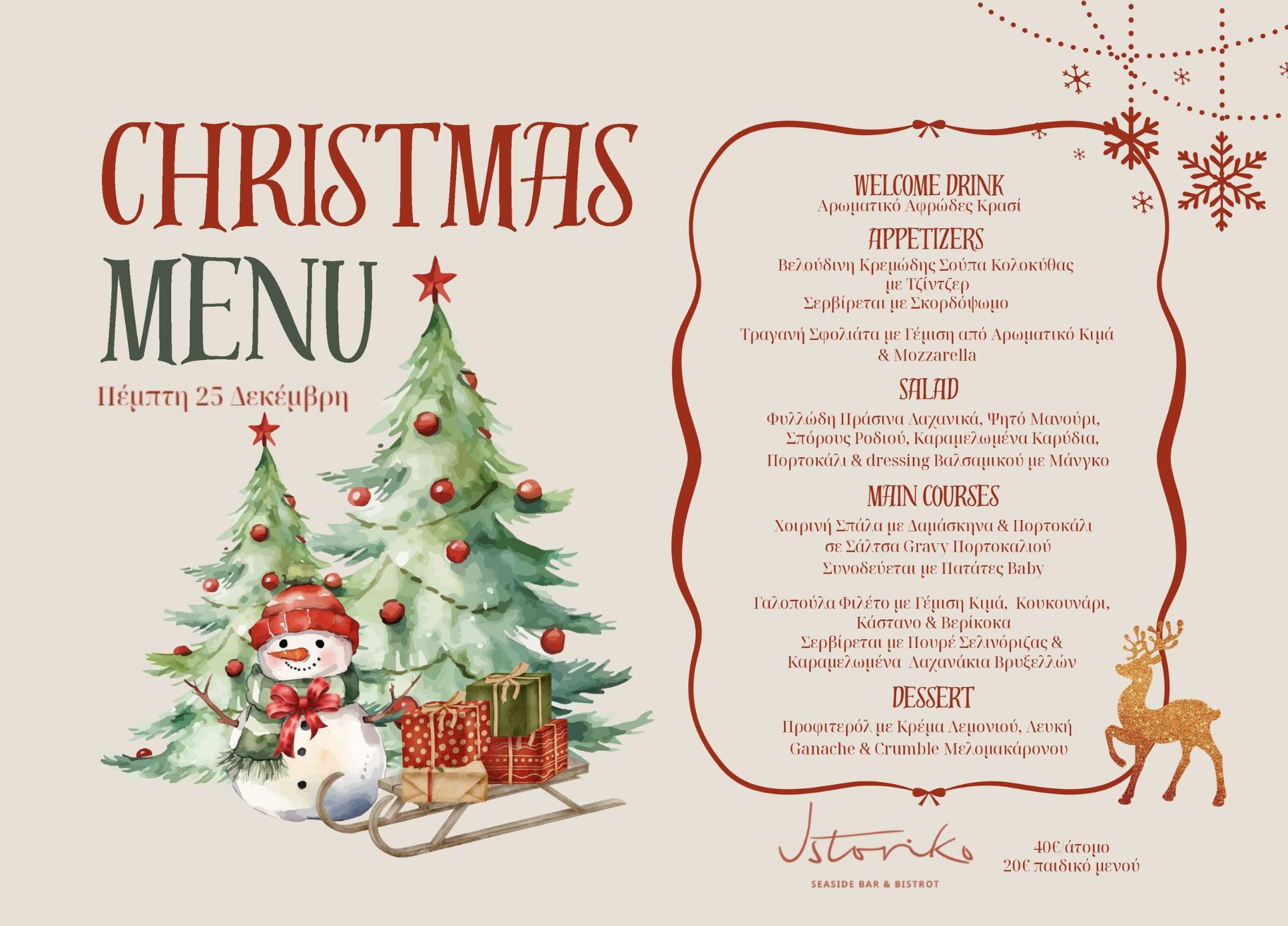 Την Πέμπτη 25 Δεκεμβρίου, το Ιστορικό υποδέχεται τις γιορτές με ένα ειδικά σχεδιασμένο Χριστουγεννιάτικο μενού, εμπνευσμένο από τη θαλπωρή της οικογένειας και τη ζεστασιά της παράδοσης. Η γαστρονομική πρόταση της ημέρας ισορροπεί ανάμεσα στην εορταστική πολυτέλεια και τη γνώριμη, σπιτική αίσθηση, με πιάτα που τιμούν την εποχή και τα υλικά της.