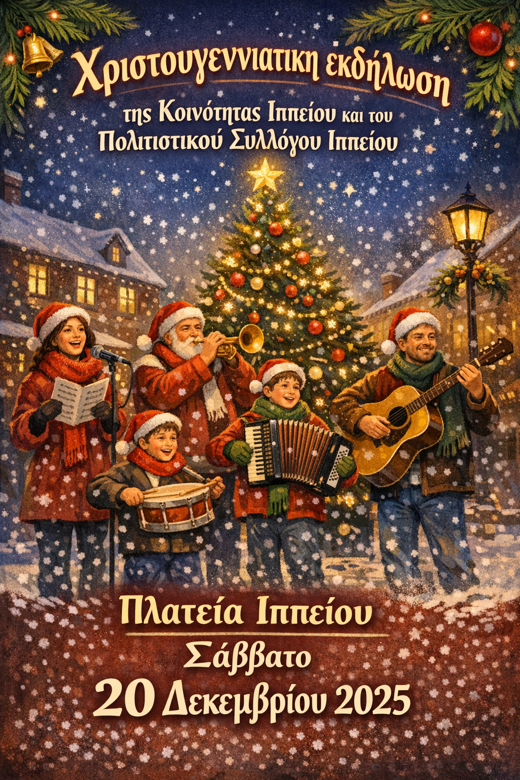 Η Κοινότητα Ιππείου και ο Πολιτιστικός Σύλλογος Ιππείου προσκαλούν όλους τους κατοίκους και επισκέπτες του χωριού μας σε μια ξεχωριστή χριστουγεννιάτικη εκδήλωση, το Σάββατο 20 Δεκεμβρίου, στις 18:00, για να γιορτάσουμε μαζί το πνεύμα των Χριστουγέννων.