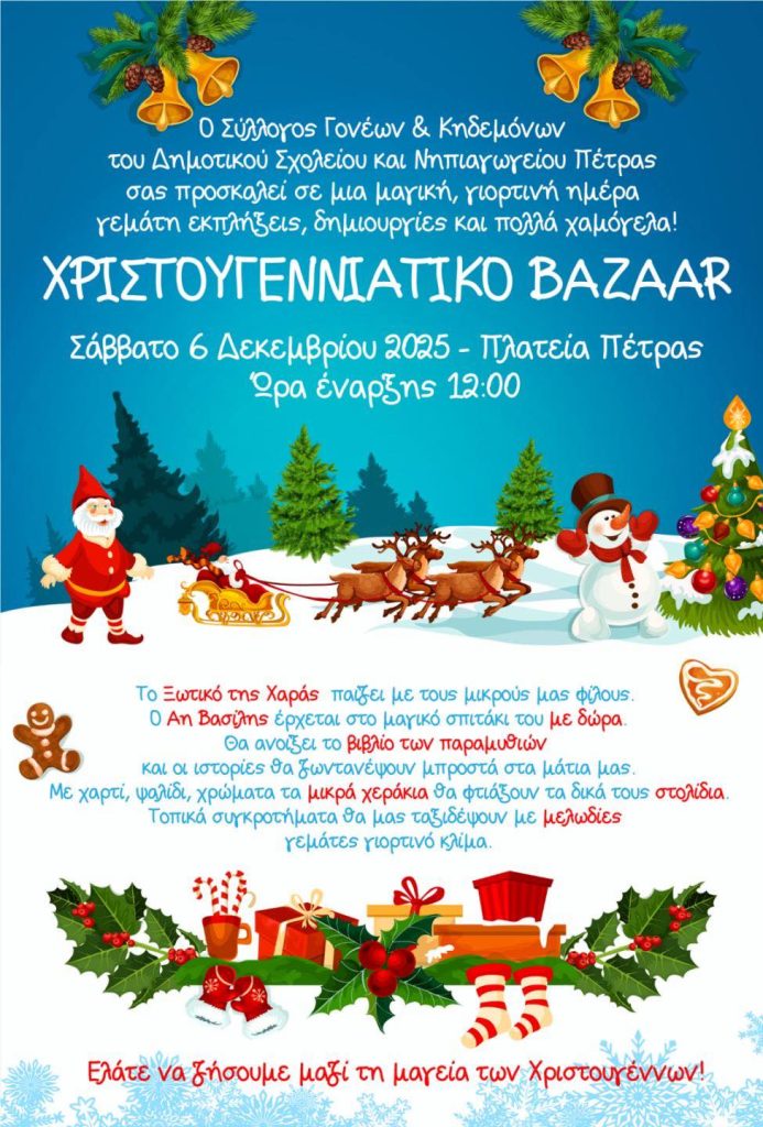Ο Σύλλογος Γονέων και Κηδεμόνων του Δημοτικού Σχολείου και Νηπιαγωγείου Πέτρας διοργανώνει ένα χαρούμενο και γιορτινό Χριστουγεννιάτικο Bazaar, το Σάββατο 6 Δεκεμβρίου 2025, στην Πλατεία Πέτρας. Η εκδήλωση θα ξεκινήσει στις 12:00 και υπόσχεται μια ημέρα γεμάτη εκπλήξεις, δημιουργίες και πολλή χαρά για όλη την οικογένεια.