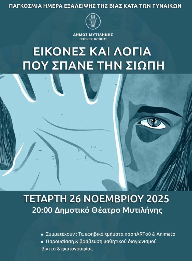 Η Παγκόσμια Ημέρα Εξάλειψης της Βίας κατά των Γυναικών δεν είναι απλώς μια ημερομηνία στο ημερολόγιο· είναι μια υπενθύμιση ότι πίσω από κλειστές πόρτες εξακολουθούν να χάνονται φωνές. Στη Μυτιλήνη, αυτές οι φωνές βρίσκουν χώρο να ακουστούν μέσα από την εκδήλωση «Εικόνες και λόγια που σπάνε τη σιωπή», την Τετάρτη 26 Νοεμβρίου στο Δημοτικό Θέατρο, που διοργανώνει η Επιτροπή Ισότητας του Δήμου.