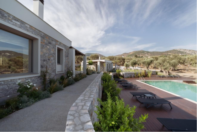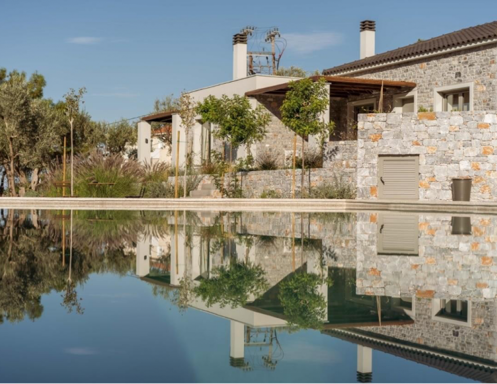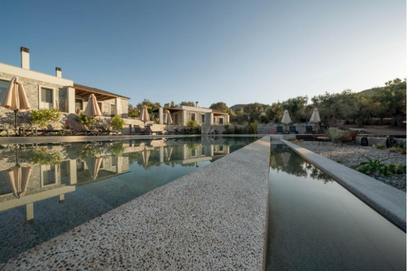 Πέντε ανεξάρτητα πέτρινα σπίτια, περιτριγυρισμένα από κήπους γεμάτους με βότανα και αρώματα, ξεκουράζονται στα χέρια του ελαιώνα. Οι αρχιτεκτονικές γραμμές τους βρίσκονται σε απόλυτη αρμονία με το φυσικό περιβάλλον ενώ τα γήινα χρώματα των σπιτιών μέσα και έξω σε συνδυασμό με την υπαίθρια πισίνα, αποτελούν μια φυσική συνέχεια του περιβάλλοντα χώρου.