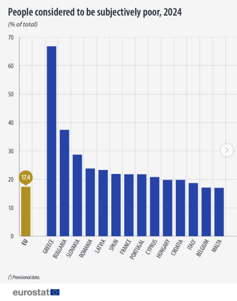 Η Eurostat καταγράφει μια μικρή μείωση της υποκειμενικής φτώχειας σε επίπεδο Ε.Ε. — από 19,1% το 2023 σε 17,4% το 2024 — ωστόσο τα ποσοστά στις χώρες του Νότου και της Ανατολικής Ευρώπης παραμένουν ανησυχητικά υψηλά.