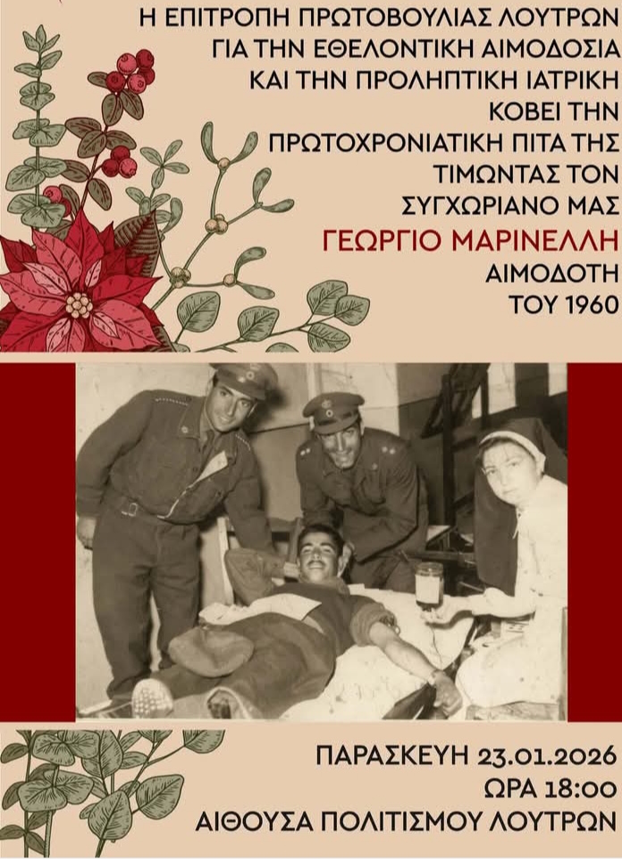 Σε μια ιδιαίτερα συγκινητική και βαθιά συμβολική εκδήλωση, η Επιτροπή Πρωτοβουλίας Λουτρών για την Εθελοντική Αιμοδοσία και την Προληπτική Ιατρική έκοψε την πρωτοχρονιάτικη πίτα της, τιμώντας έναν άνθρωπο-σύμβολο της προσφοράς.