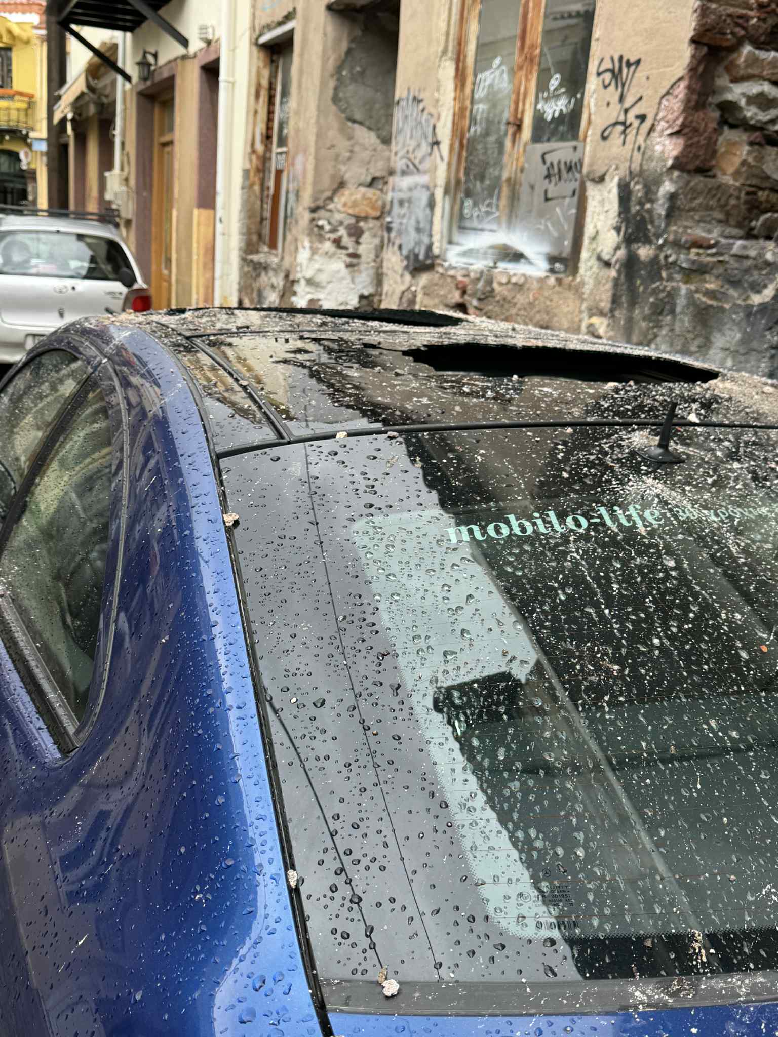Κομμάτια στέγης από εγκαταλελειμμένο κτίριο έπεσαν πάνω σε σταθμευμένα οχήματα. Ευτυχώς χωρίς τραυματισμούς.