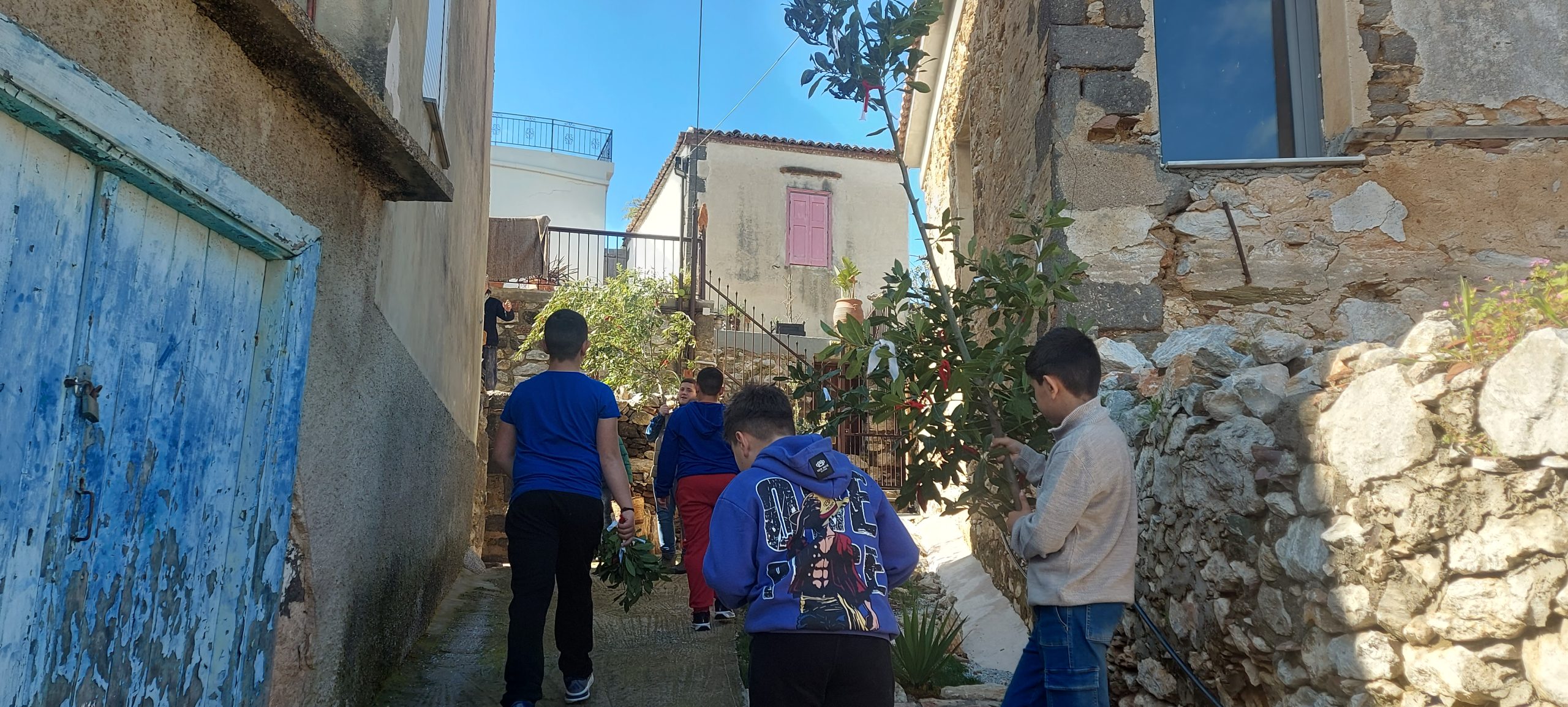 Μικροί και μεγάλοι συμμετέχουν με ενθουσιασμό, περνώντας από γειτονιές και σπίτια του χωριού, κρατώντας τις βάγιες και μεταφέροντας το μήνυμα της ημέρας με χαρά και κατάνυξη. Το έθιμο, βαθιά ριζωμένο στην τοπική παράδοση, φέρνει κοντά τις γενιές και διατηρεί ζωντανή την πολιτιστική κληρονομιά του τόπου.
