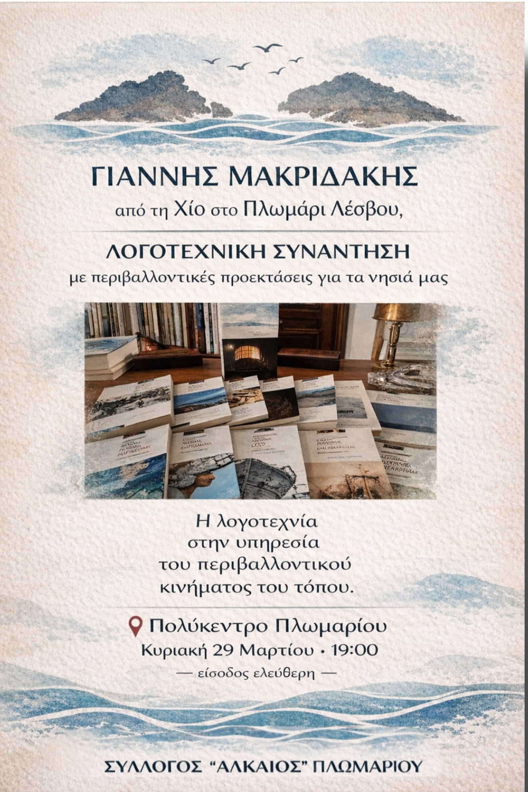 Η εκδήλωση, με ελεύθερη είσοδο, διοργανώνεται από τον Σύλλογο «Αλκαίος» Πλωμαρίου και αναμένεται να συγκεντρώσει φίλους της λογοτεχνίας, αναγνώστες και πολίτες που ενδιαφέρονται για την προστασία του τόπου.