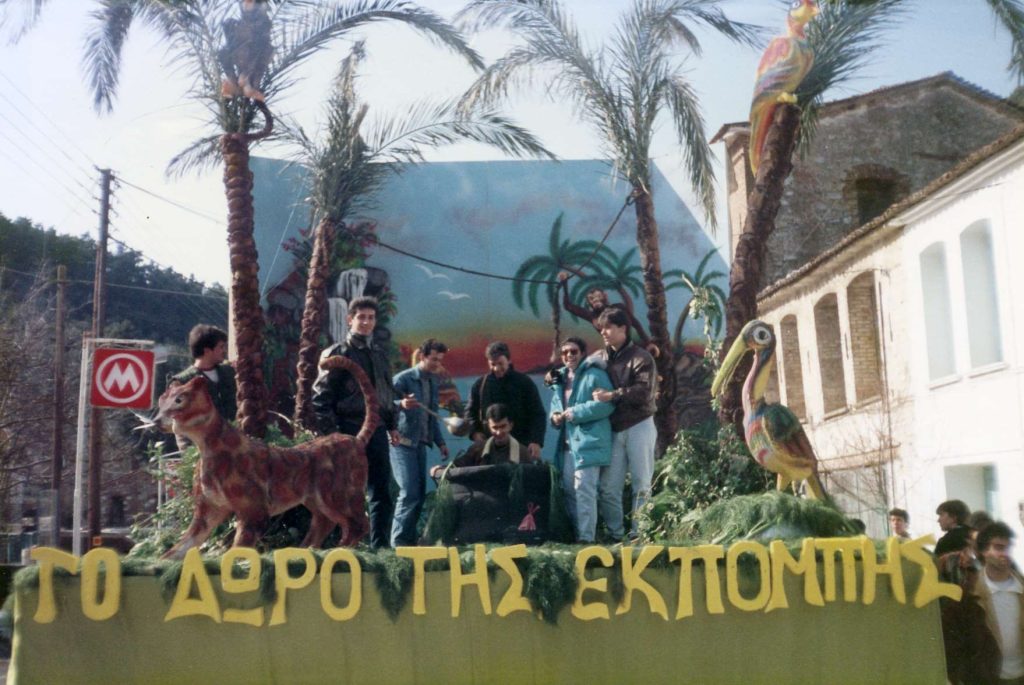 Ο Γιώργος Πολυχρονίου, με κάτι όμορφες, γύριζαν τον «Τροχό της Τύχης», ο Βλάσης Μπονάτσος («φύγε συ έλα συ», «… πάρα πολύ ωραίο») έβαζε δύο ομάδες να κάνουν «Κόντρες» και εμείς αποσβολωμένοι χαζεύαμε τον Ανδρέα Μικρούτσικο, τη Μαίρη Μηλιαρέση, τον Χρήστο Φερεντίνο και άλλους πιονέρους τα πρώτα εκείνα ένδοξα χρόνια της ελληνικής ιδιωτικής τηλεόρασης να χαρίζουν (σε άλλους, δυστυχώς) εκατομμύρια (σε δραχμές έστω). Για να μην τα πολυλογώ, φάγαμε τα σαρακοστιανά μας σε κάποια αλάνα της Αγιάσου (είναι κάτι πράγματα που, άγνωστο πως, τυπώνονται στη μνήμη: στη φωτογραφία τρώω αγγουράκι τουρσί, το θυμάμαι 34 χρόνια μετά) και πήγαμε στον χώρο του καρναβαλιού.