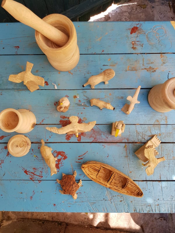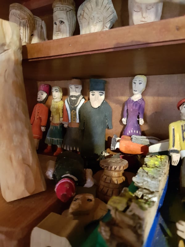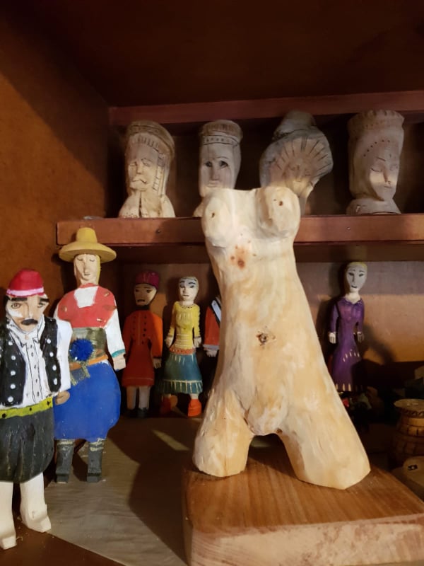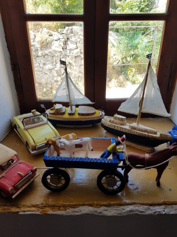 Ζωάκια, φιγούρες, καράβια, αυτοκίνητα που ήταν και η πρώτη του ενασχόληση, κείτονται σε διάφορα σημεία του σπιτιού σαν μουσειακά αντικείμενα. Συνήθως διαλέγει ξύλο ελιάς η άλλα είδη πιο επεξεργάσιμα και μπαίνει μέσα στο δωματιάκι της αυλής όπου έχει και τα σύνεργά του για να δώσει σχήμα στις άμορφες ξύλινες μάζες .Όλα έχουν κάτι το ιδιαίτερο. Αλλά την παιδικότητα, άλλα την λαϊκότητα , άλλα την φαντασία.