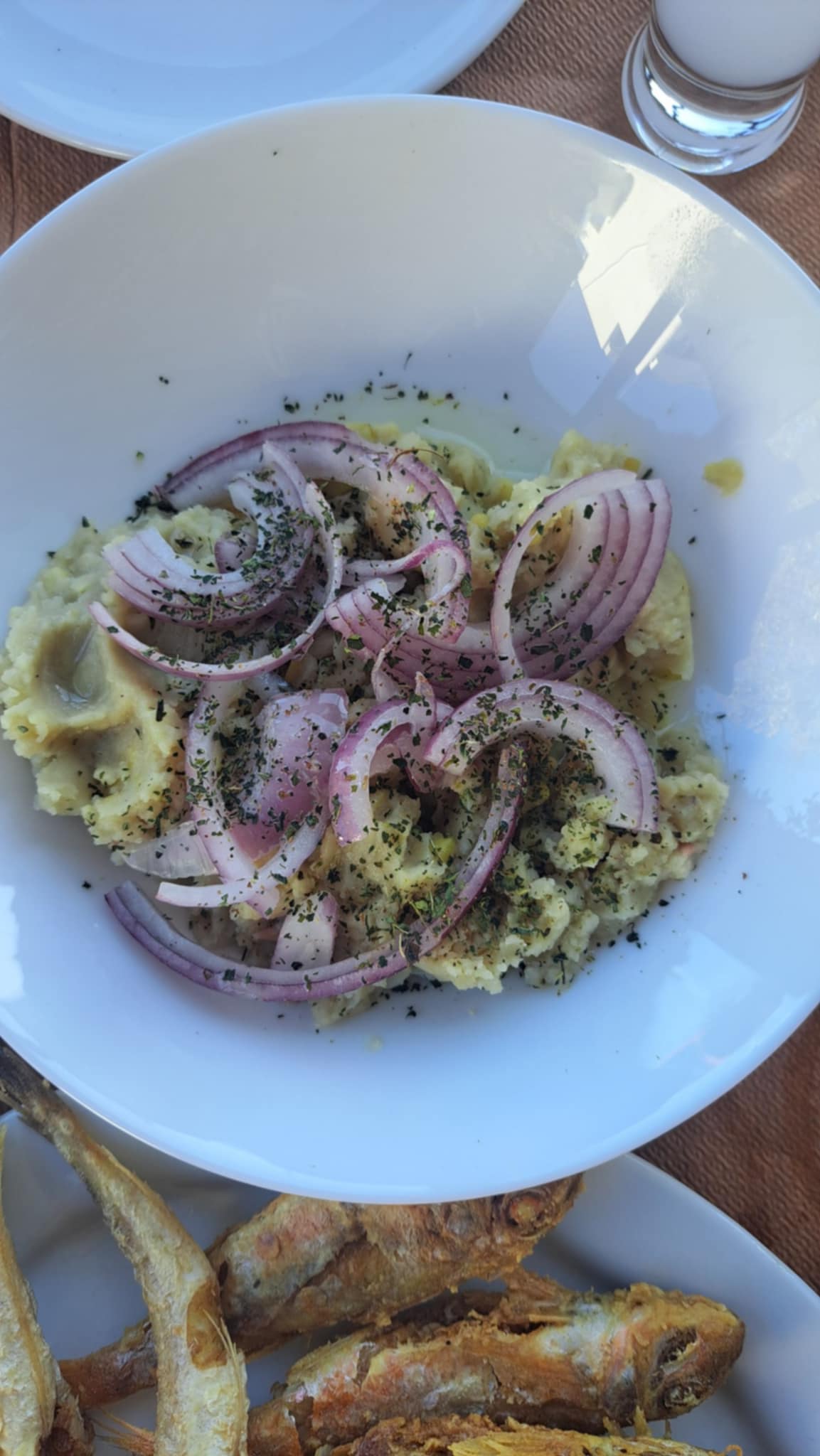 Η φάβα από κουκιά έρχεται με κρεμμυδάκι και μπόλικο λάδι να ισορροπήσει τη γλύκα της. Τα αφρόψαρα σιγοτηγανίζονται ώσπου να πάρουν τη σωστή τραγανότητα, ενώ στο πιάτο μπορούν να βρεθούν και οι «guest star» μεζέδες — ό,τι βρέθηκε φρέσκο στην αγορά εκείνο το πρωί.