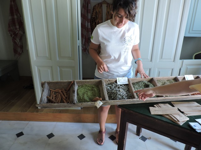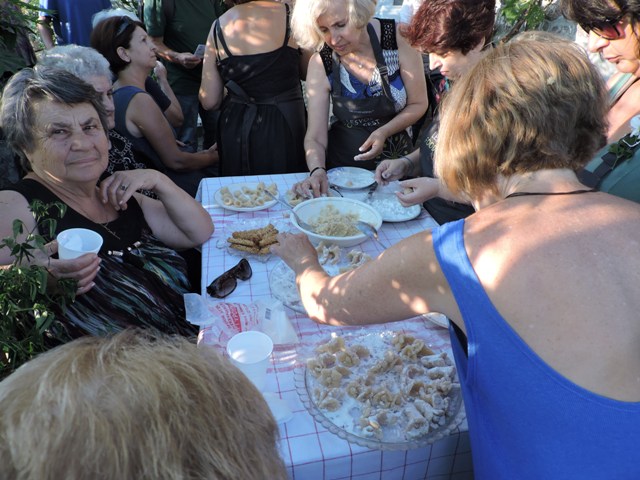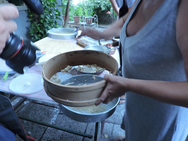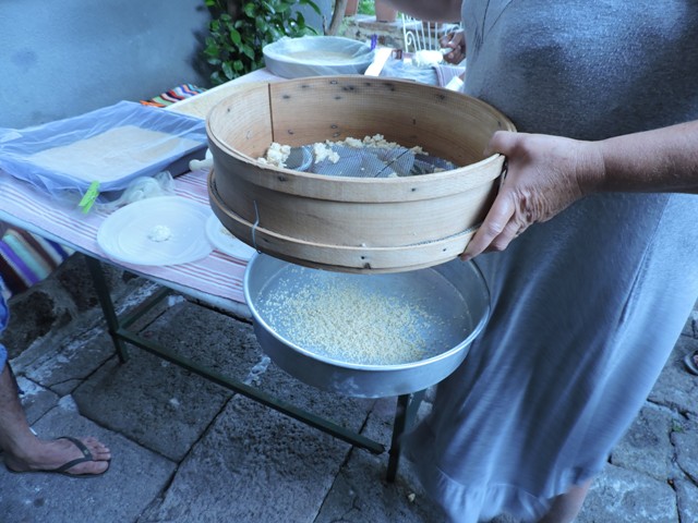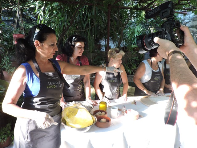 (φτιάχνοντας τις παραδοσιακές χάχλες.Η χάχλα είναι μια μορφή τραχανά που συναντούμε αποκλειστικά στην Λέσβο. Ο τραχανάς, από τις πιο παλιές επεξεργασμένες τροφές της ανατολικής Μεσογείου, έχει κοκκώδη μορφή και γίνεται από σιτάλευρο ή και σπασμένο σιτάρι, πλιγούρι ή σιμιγδάλι, βράζεται σε γάλα, γιαούρτι ή ξινόγαλα, ή με πολτοποιημένα λαχανικά ή μπαχάρια.)