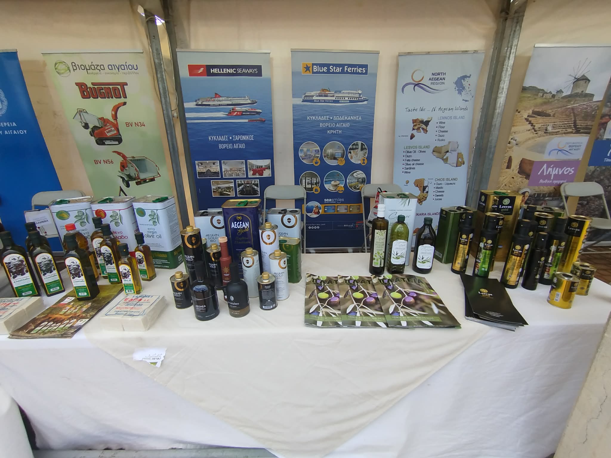 Η Περιφέρεια Βορείου Αιγαίου, συμμετείχε με ένα μεγάλο περίπτερο συνολικού εμβαδού 60 τ.μ., εντός του οποίου φιλοξενήθηκαν εντελώς δωρεάν: α) οι ελαιοκομικές επιχειρήσεις του Βορείου Αιγαίου που συμμετείχαν με φυσική παρουσία εκπροσώπων τους, β) οι ελαιοκομικές επιχειρήσεις των νησιών που συμμετείχαν με ασυνόδευτα ελαιοκομικά προϊόντα προς διαφήμιση, και γ) τα συνοδευτικά των ελαιοκομικών προϊόντων, που χρησιμοποιήθηκαν για τις γευσιγνωστικές δοκιμές – κεράσματα προς τους επισκέπτες.