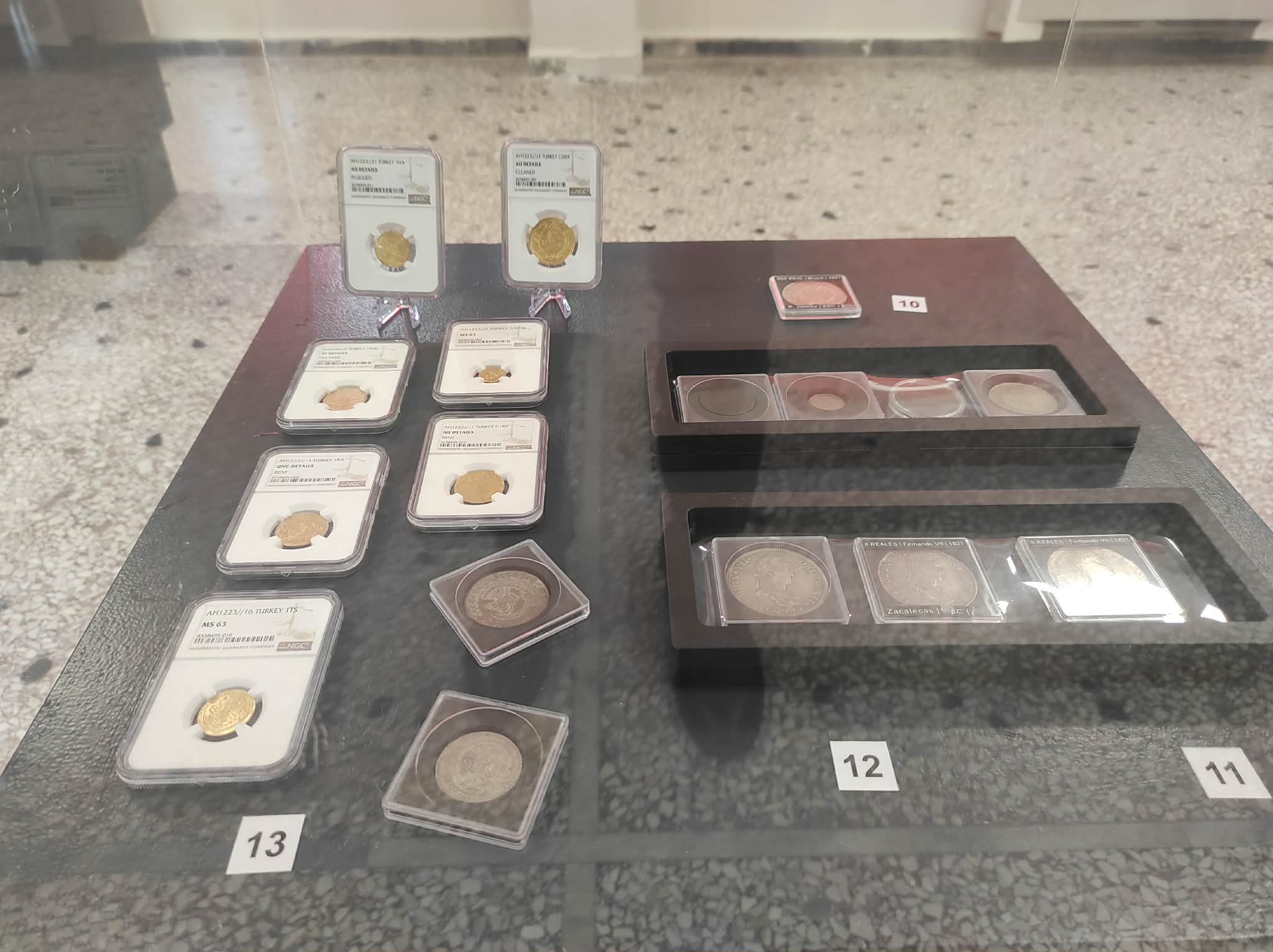 Κατά τη διάρκεια των εγκαινίων ο δήμαρχος Δυτικής Λέσβου, Ταξιάρχης Βέρρος, -συλλέκτης και ο ίδιος- μοιράστηκε γνώσεις και πολύτιμες πληροφορίες για τα εκθέματα, αναδεικνύοντας τη σημασία τους και τη σχέση τους με τα γεγονότα της εποχής. Ιδιαίτερη θέση στην έκθεση κατέχουν ο Φοίνικας του Ιωάννη Καποδίστρια (1828) και οι πρώτες δραχμές του βασιλιά Όθωνα (από το 1833), ενώ ξεχωρίζουν και τα πρώτα ελληνικά γραμματόσημα «Κεφαλές του Ερμή» (1861). Τα νομίσματα προέρχονται από ιδιωτική συλλογή, ενώ τα γραμματόσημα παρουσιάζονται με την επιμέλεια της Φιλοτελικής Εταιρείας Λέσβου.