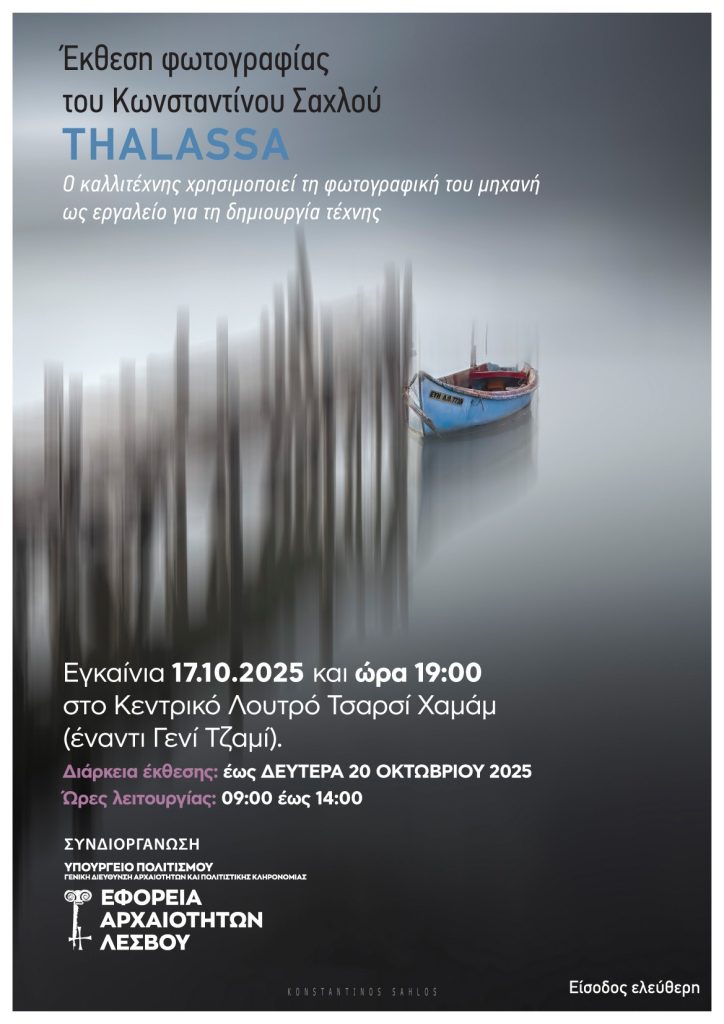 Η Εφορεία Αρχαιοτήτων Λέσβου προσκαλεί το κοινό στα εγκαίνια της νέας έκθεσης φωτογραφίας «THALASSA» του Κωνσταντίνου Σαχλού, που θα πραγματοποιηθούν την Παρασκευή 17 Οκτωβρίου στις 19:00, στο Τσαρσί Χαμάμ στη Μυτιλήνη.