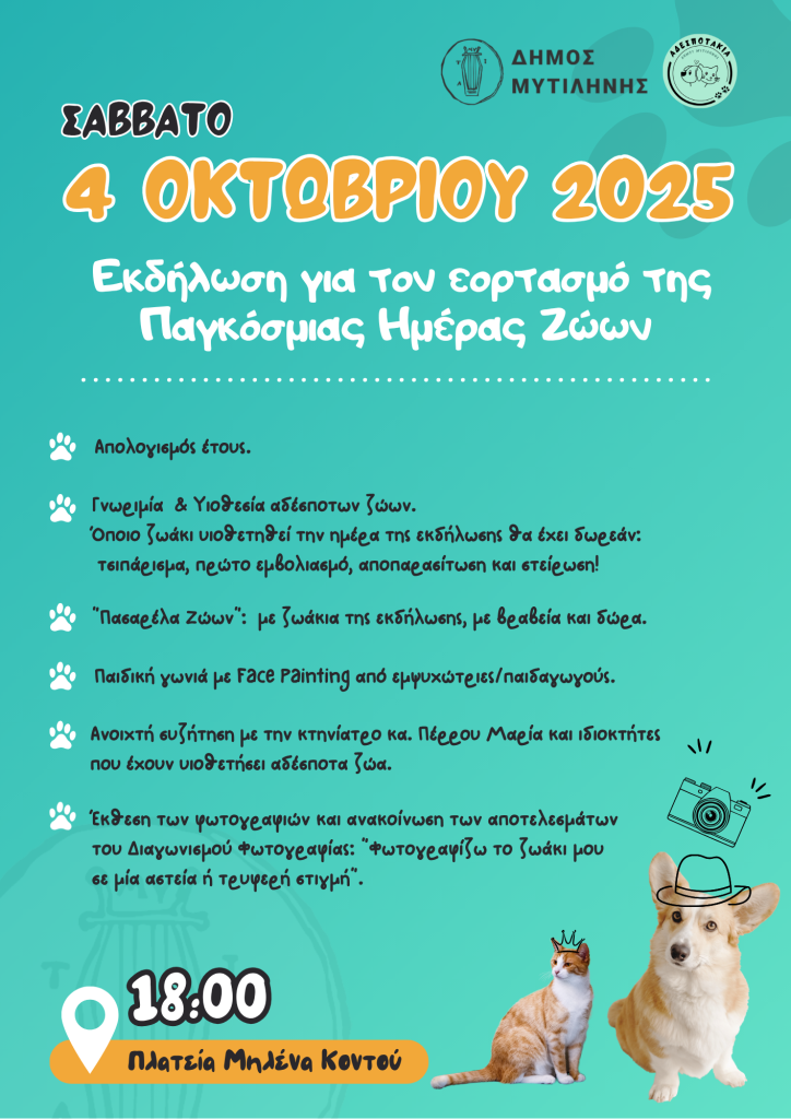 Ο Δήμος Μυτιλήνης διοργανώνει εκδήλωση για την Παγκόσμια Ημέρα Ζώων με υιοθεσίες, δράσεις για παιδιά και φωτογραφικό διαγωνισμό.